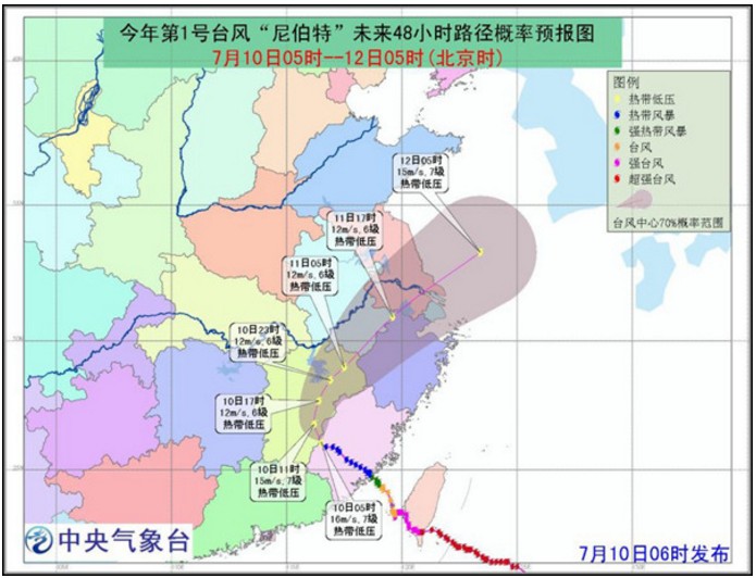 中央氣象臺(tái)預(yù)計(jì),熱帶低壓將以每小時(shí)10-15公里的速度向偏北方向移動(dòng),強(qiáng)度逐漸減弱,并逐漸轉(zhuǎn)向北偏東方向移動(dòng),之后穿過(guò)江西,經(jīng)浙江、安徽、江蘇等省后,12日將移入黃海南部海面。中央氣象臺(tái)于10日早晨6點(diǎn)鐘解除臺(tái)風(fēng)藍(lán)色預(yù)警。